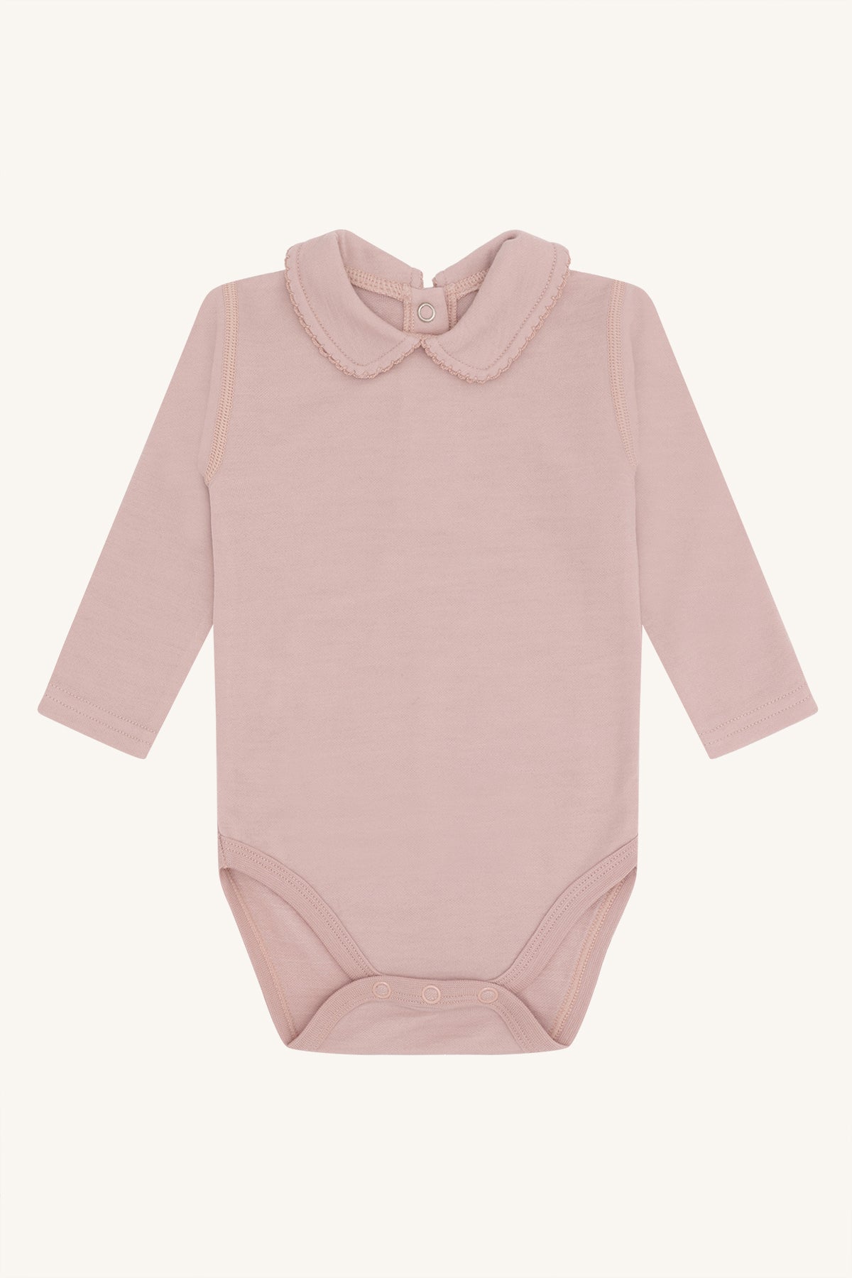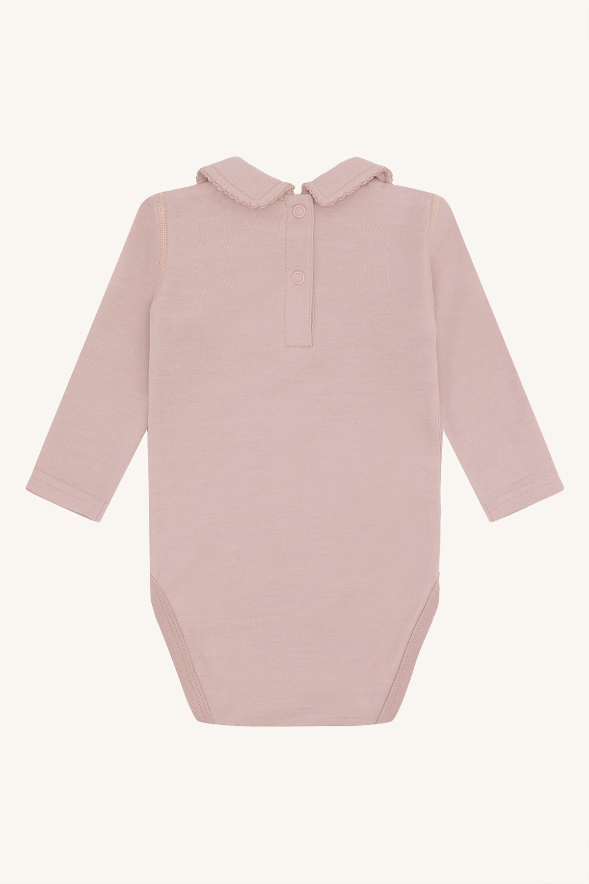 Der langarm Body von Hust and Claire ist aus bequemer Merinowolle und Bambus-Viskose. Der weiche Body hat einen hübschen Kragen, was dem Body eine gewisse Eleganz verleiht. Die Knöpfe auf der linken Schulter und im Schritt erleichtern das An- und Ausziehen, sowie auch das Wickeln. Der kuschelige Body hat aussen eine Wollschicht und innen feine Bambusviskose. Dank des tollen Materialmix reguliert der Babybody wunderbar die Wärme/Kälte und eignet sich optimal für die kältere Jahreszeit.