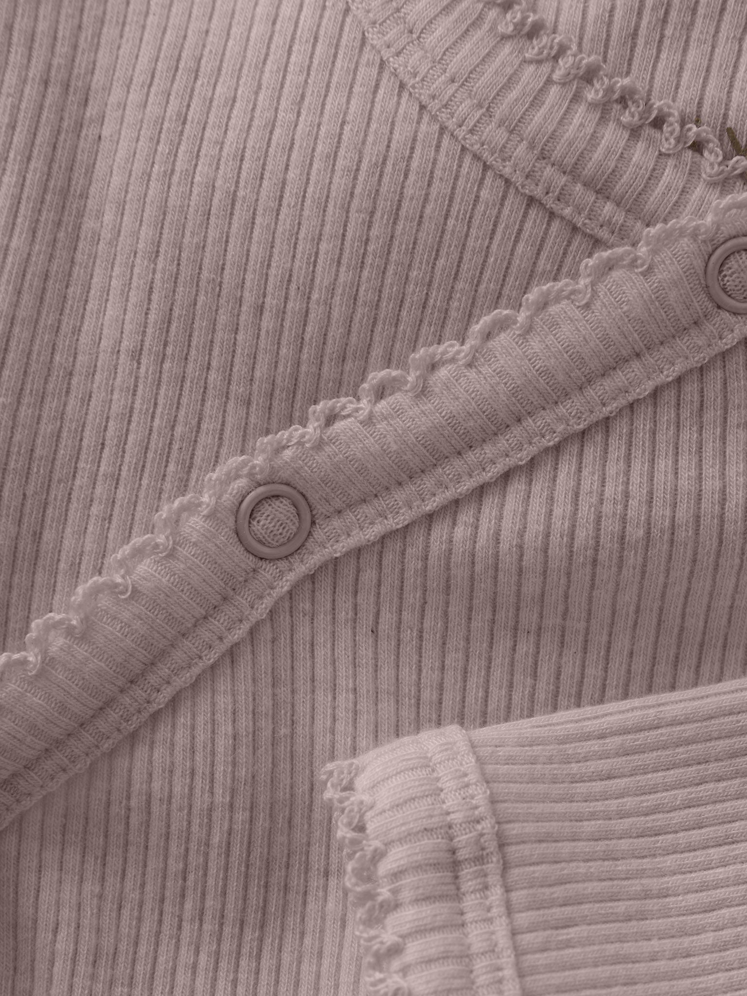 Dieser superfeine gerippte Langarmbody mit Spitzendetails von Fixoni besteht aus Baumwolle und TENCEL™ Modal, diese Fasern werden aus Buchenholz hergestellt. Das heisst, das Material fühlt sich an wie Kunstseide, super weich und sehr angenehm zu tragen. Der weiche Wickelbody hat Druckknöpfe von oben bis nach unten, um das An- und Ausziehen sowie das Wickeln zu erleichtern.