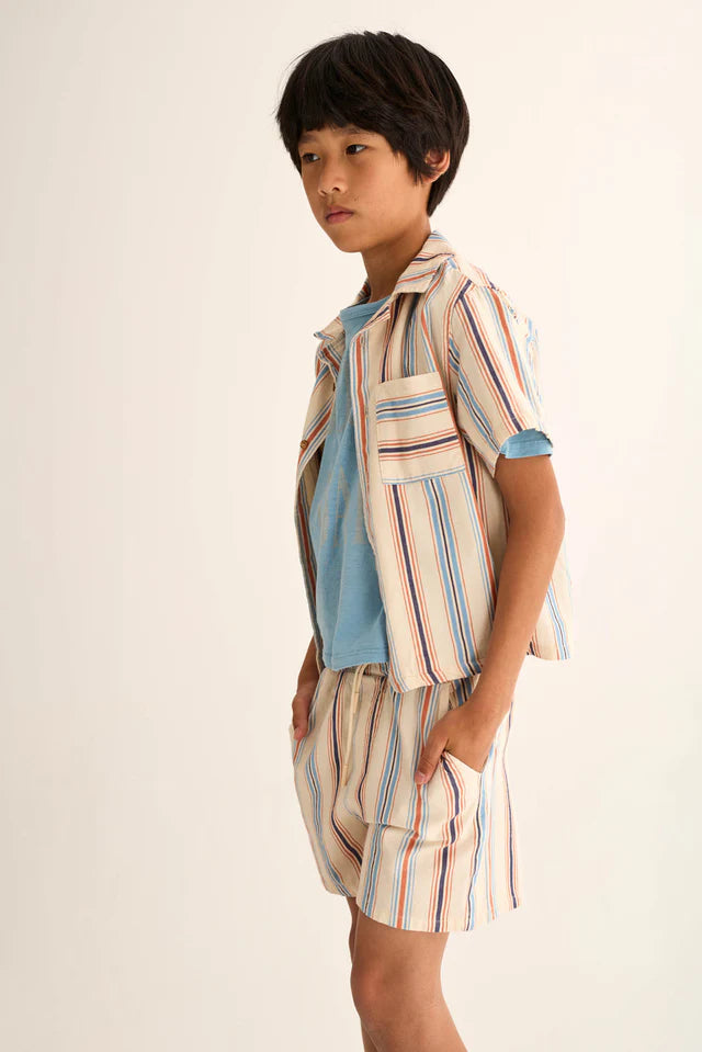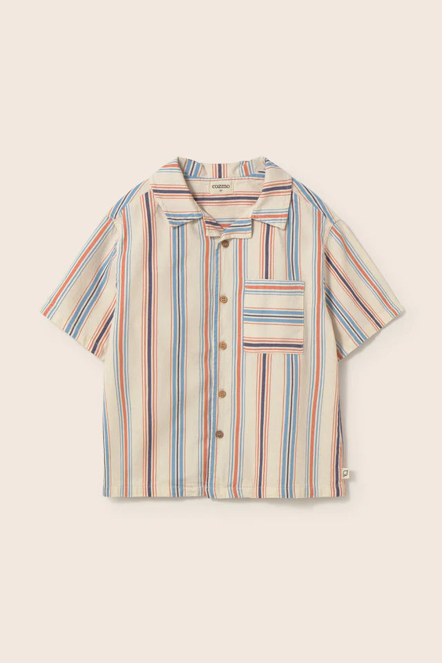 Das lässige kurzarm Hemd von Cozmo besteht zu 100% aus Bio-Baumwolle. Das Kinderhemd hat links eine aufgesetzte Brusttasche und vorne eine Knopfleiste. Der feine Baumwollstoff ist super angenehm zu tragen und eignet sich perfekt für die warme Jahreszeit. Passend zu diesem coolen Hemd ist auch die Shorts im gleichen Muster und Material bei uns erhältlich.