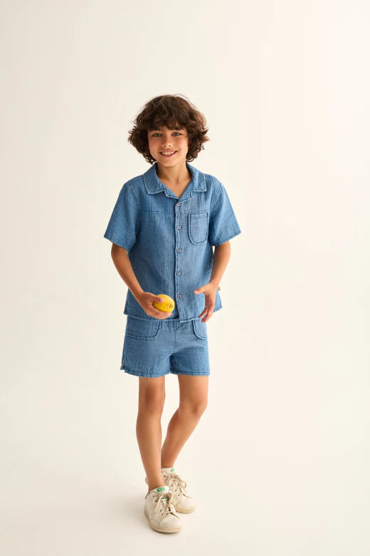 Das demim blaue unisex kurzarm Musselin-Hemd von Cozmo besteht zu 100% aus Baumwolle. Das Kinderhemd hat links eine aufgesetzte Brusttasche und vorne eine Knopfleiste. Der feine Baumwollstoff ist super angenehm zu tragen und eignet sich perfekt für die warme Jahreszeit.