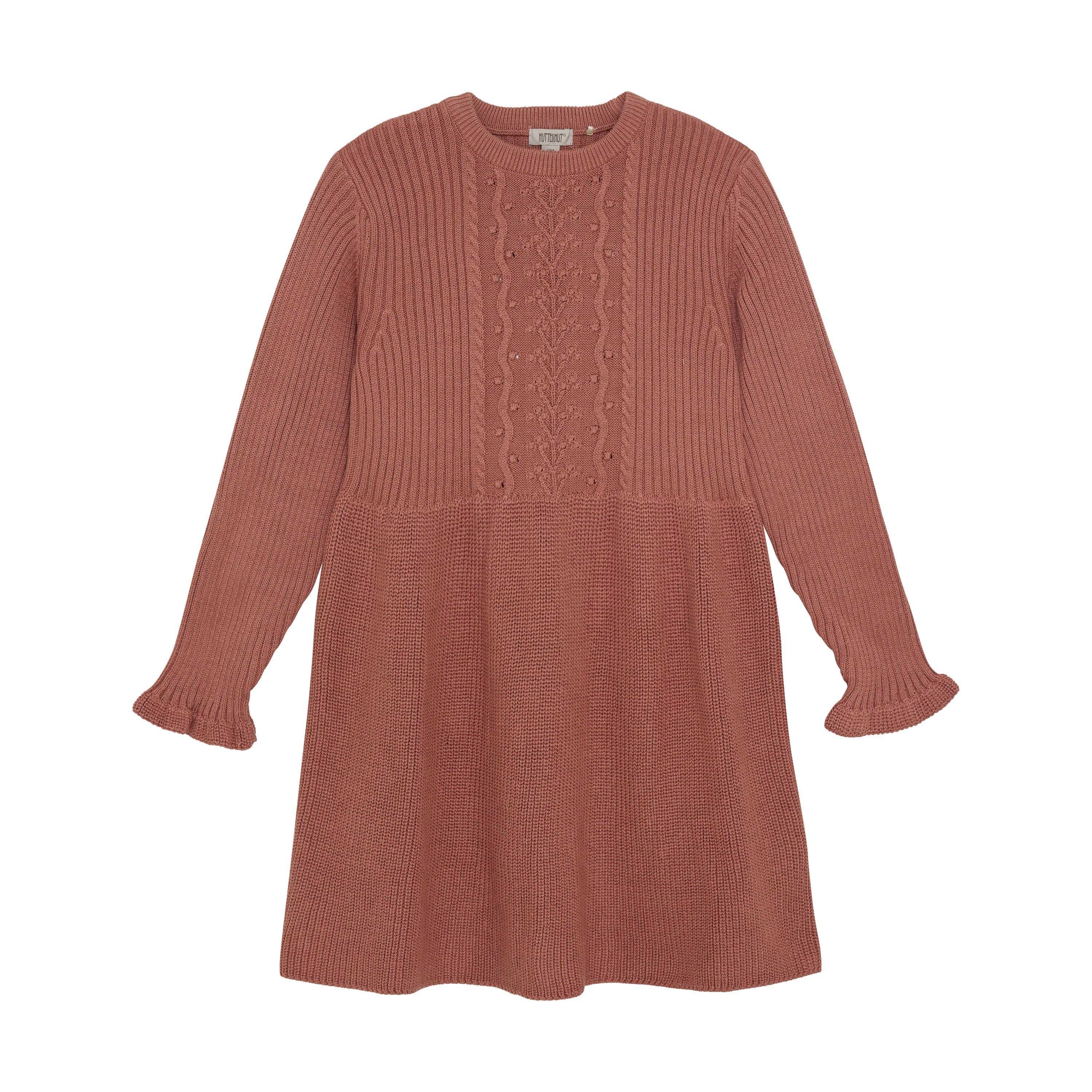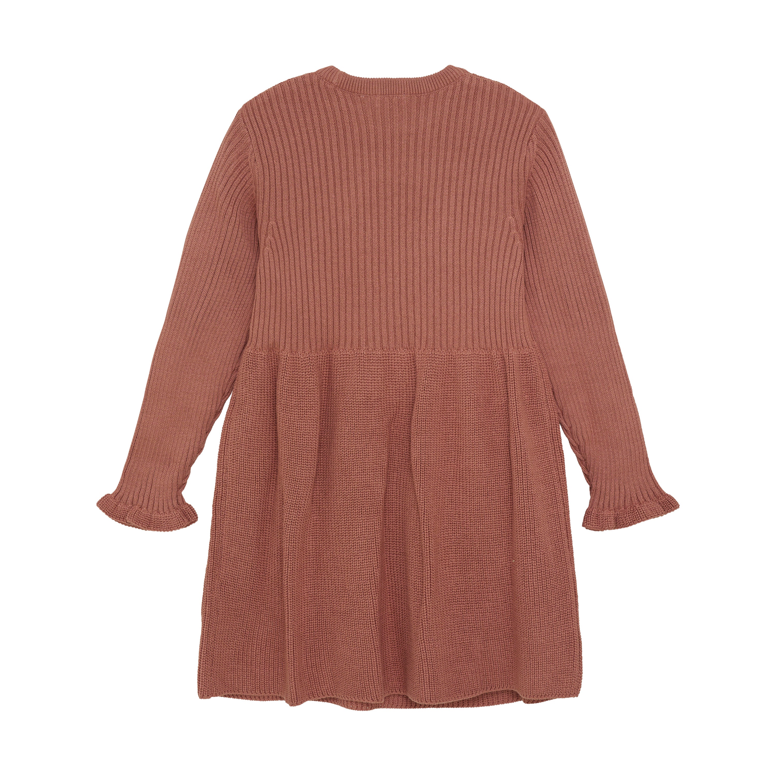 Dieses schöne langärmelige Strickleid von Huttelihut besteht zu 100% aus Bio-Baumwolle. Das Herbstkleid hat einen runden Ausschnitt und feine Details wie ein Strickmuster auf der Vorderseite und einen kleinen Rüschenrand an den Ärmeln. Das Kleid ist oben im Rippenmuster gestrickt und der Rock ist gerade/links gestrickt und hat eine schöne Weite.