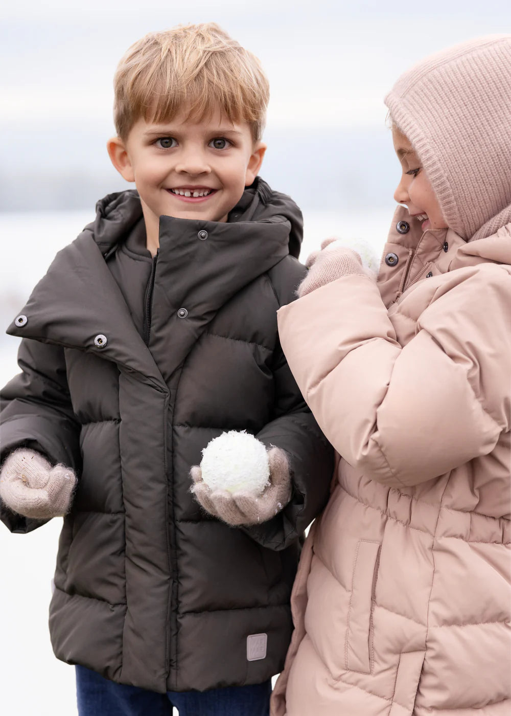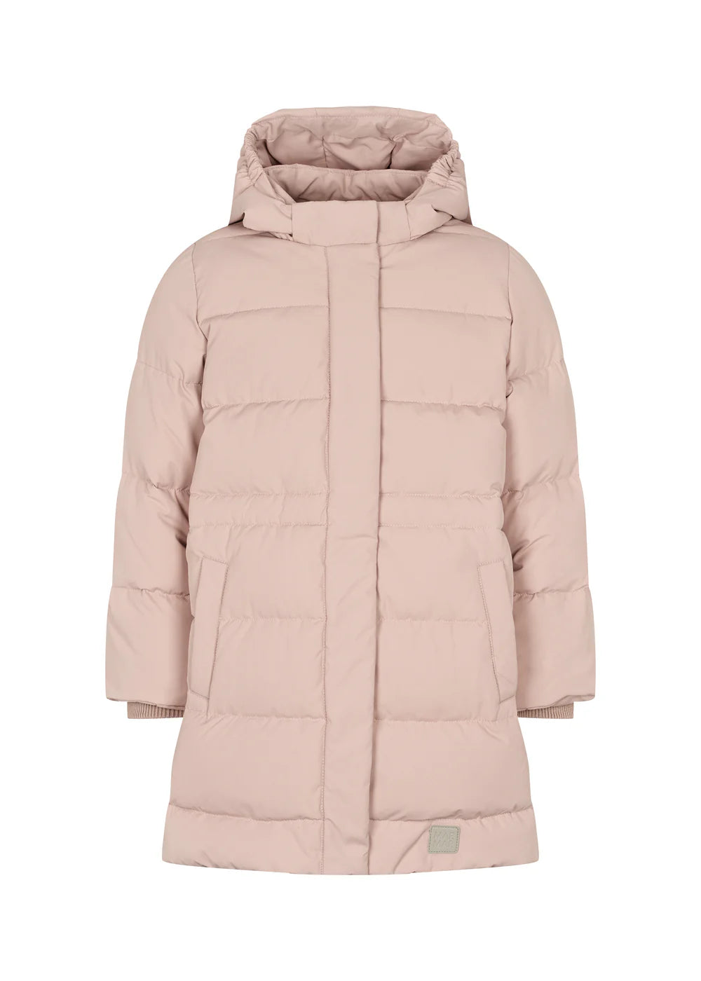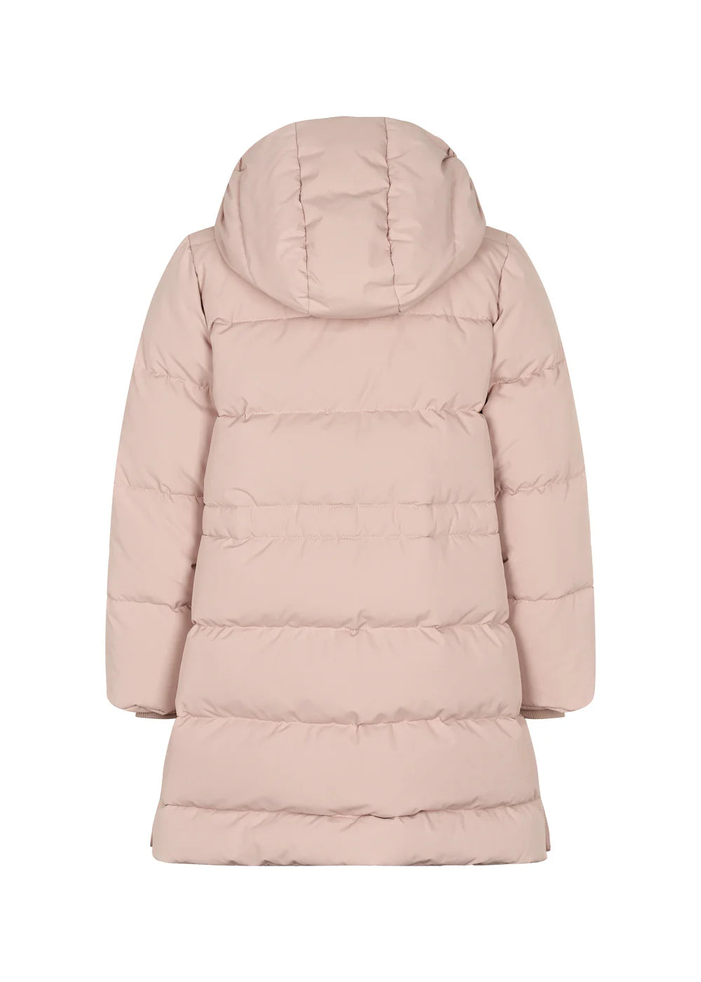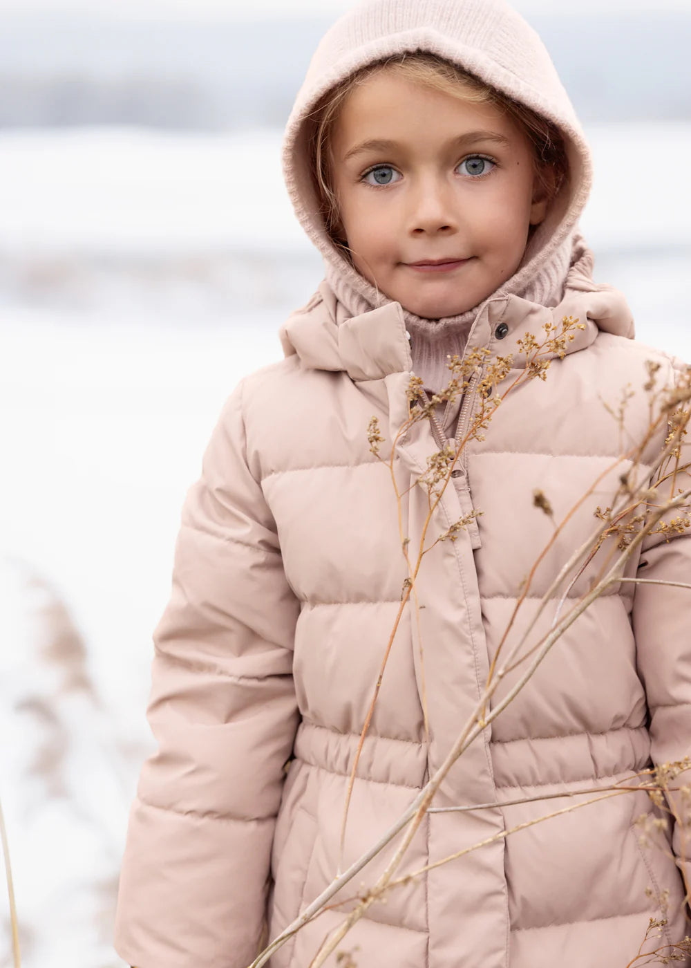 Dieser schöne Daunen-Puffermantel im hellen Altrosa mit elastischen Bund, der innen für einen femininen Look angepasst werden kann, von MarMar Copenhagen hat eine abnehmbare Kapuze, zwei Seitentaschen, einen Frontreissverschluss und Druckknöpfe. Der weiche Mantel hat einen Knopfverschluss auf der Rückseite und eng anliegende Handgelenke, sodass keine Kälte eindringt kann. Der flauschige Puffermantel ist atmungsaktiv und hat einen Wassersäulendruck von 5000mm, das heisst er ist gut wind- und wasserdicht. Das weiche Fleecefutter am Kinn, Rumpf und in den Seitentaschen machen den Kindermantel besonders kuschelig. Die gerippten Armabschlüsse geben ein besonders angenehmes Tragegefühl.