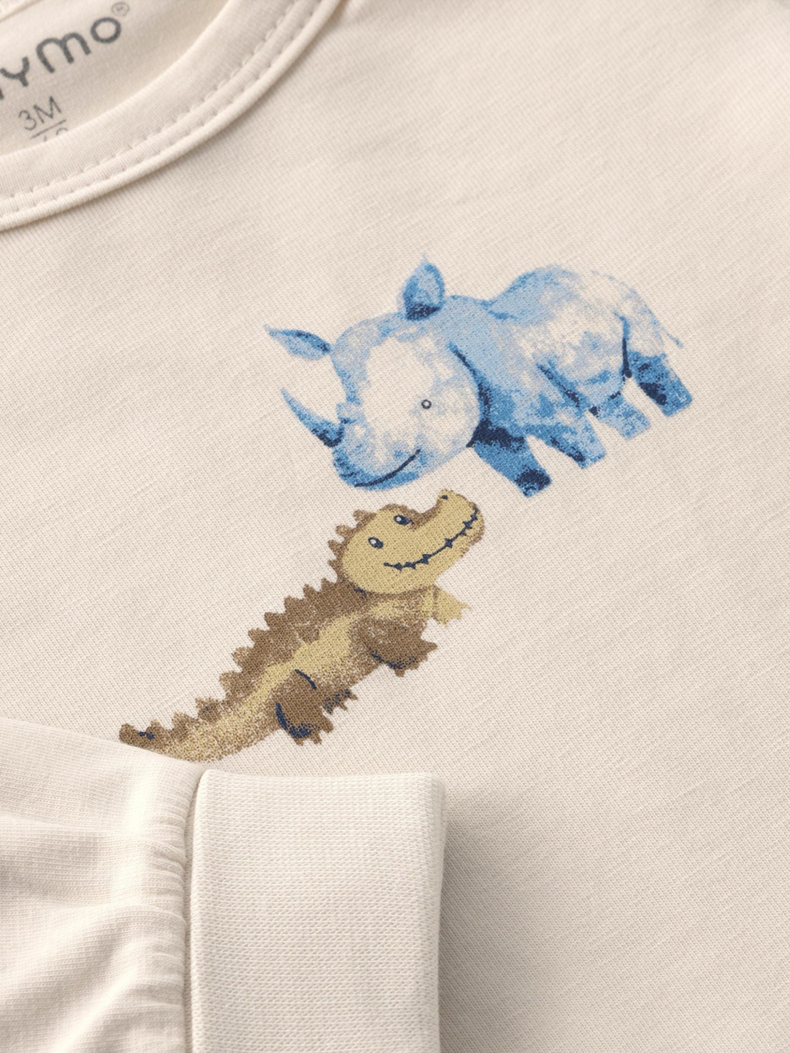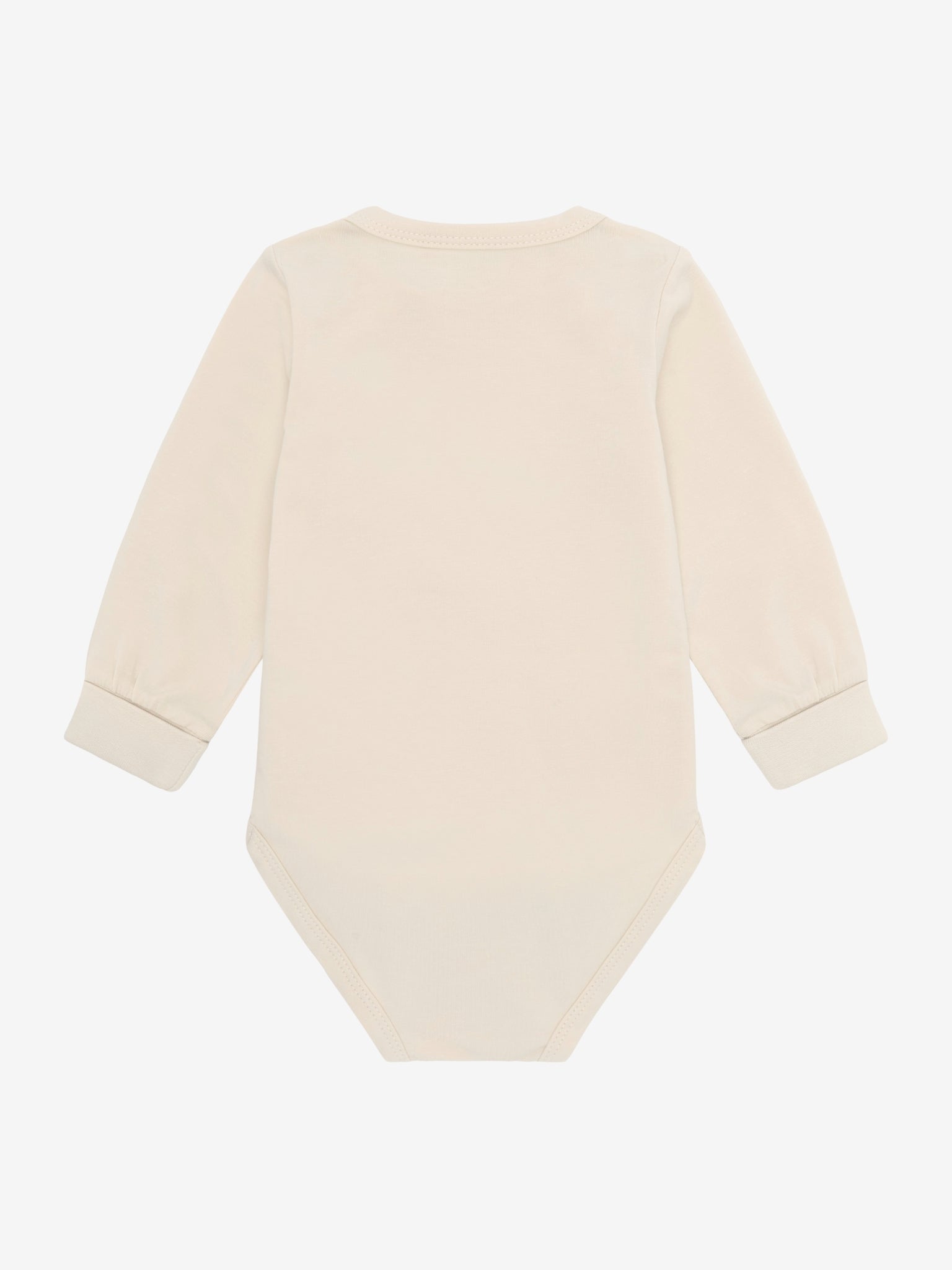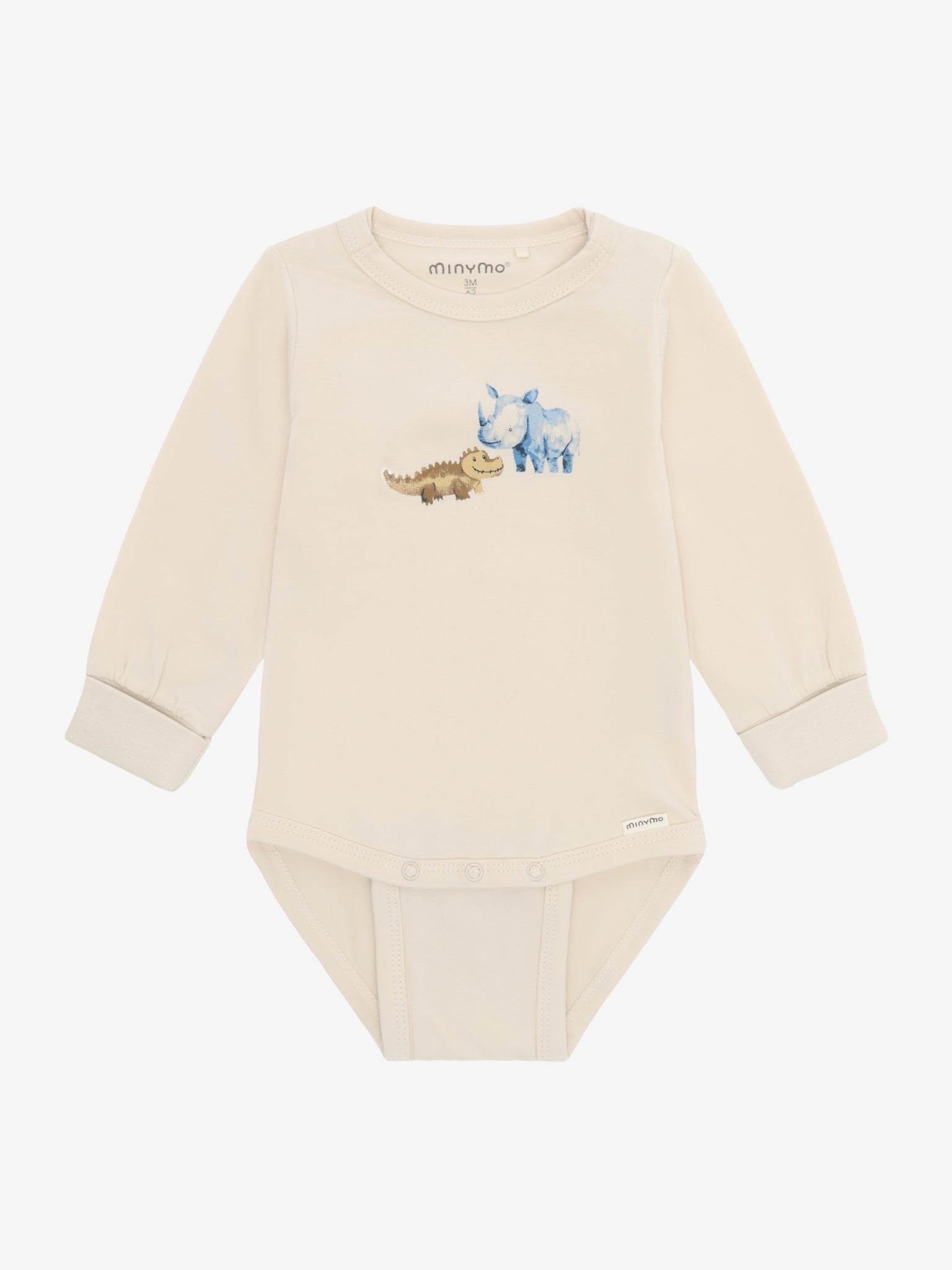 Dieser weiche mitwachsende Babybody von Minymo besteht aus Bio-Baumwolle. Der Langarmbody ist uni beige und hat einen kleinen Tierprint auf der Brust. Die Druckknöpfe auf der Schulter und im Schritt vereinfachen das An- und Ausziehen.