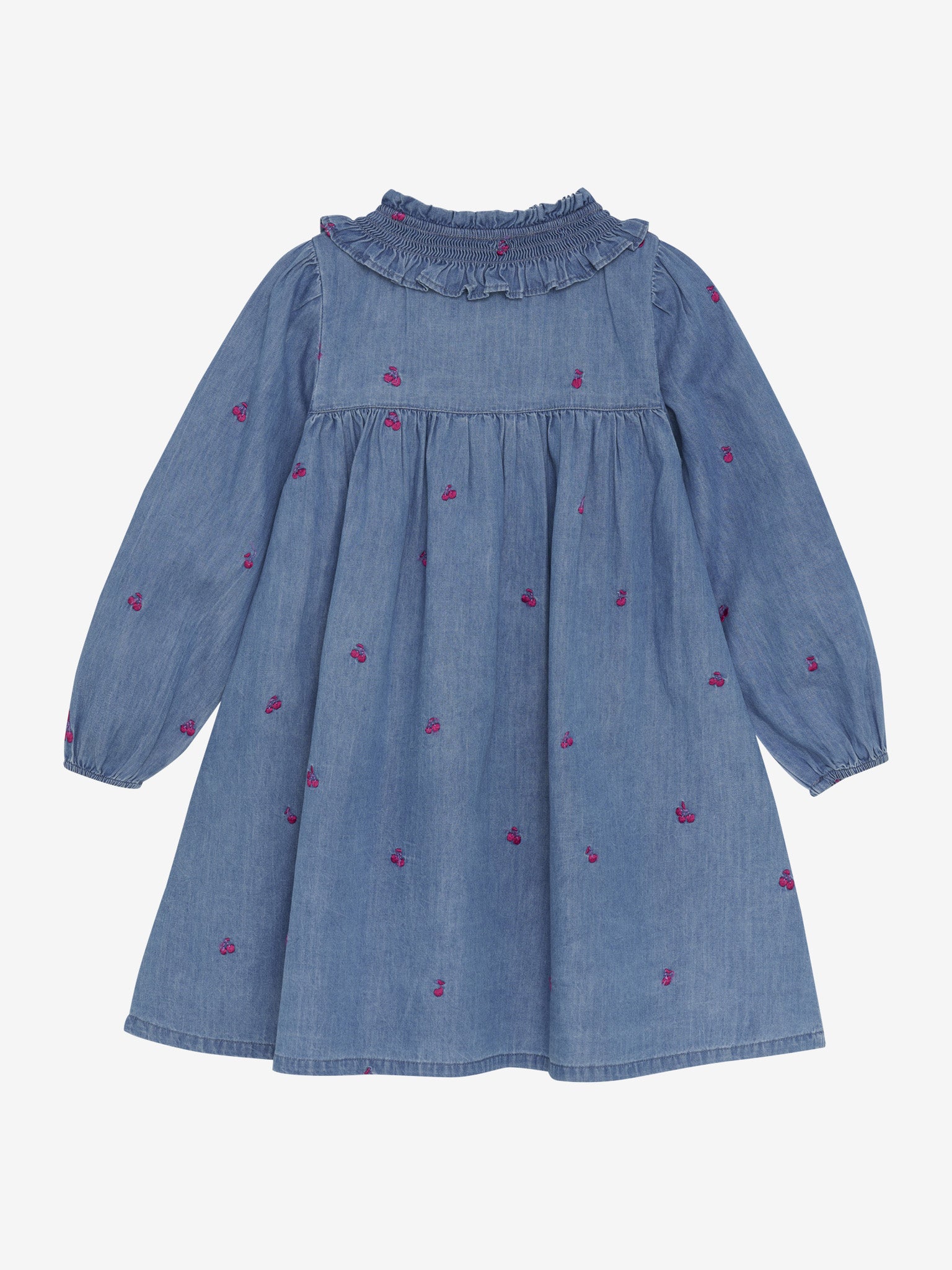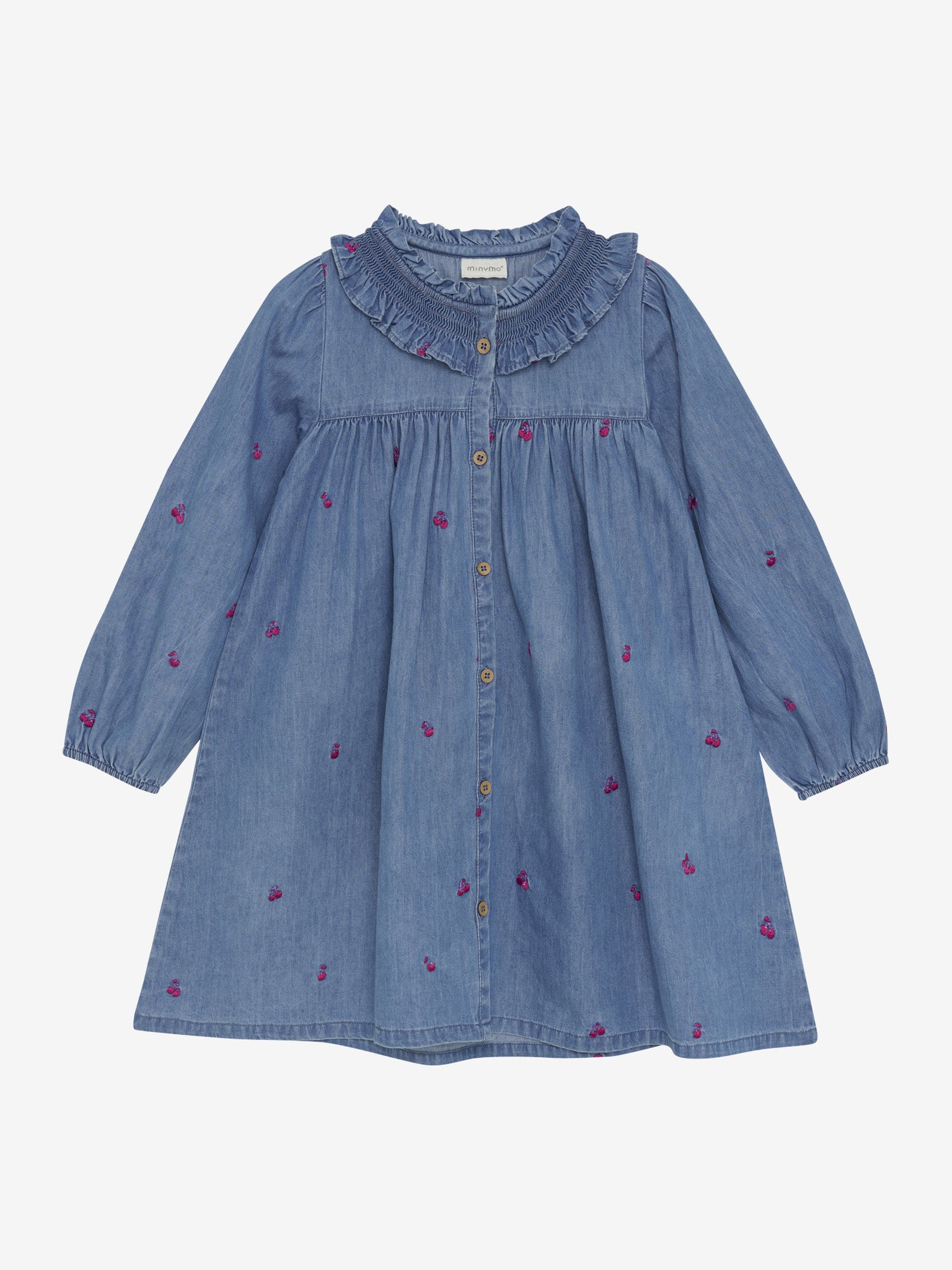 Dieses schöne dünne Jeanskleid mit langen Armen von Minymo besteht zu 100% aus Baumwolle. Das luftige Kleid hat feine Kirschstickereien, einen gerafften Kragen, elastische Armabschlüsse und wird vorne mit Knöpfen geschlossen.