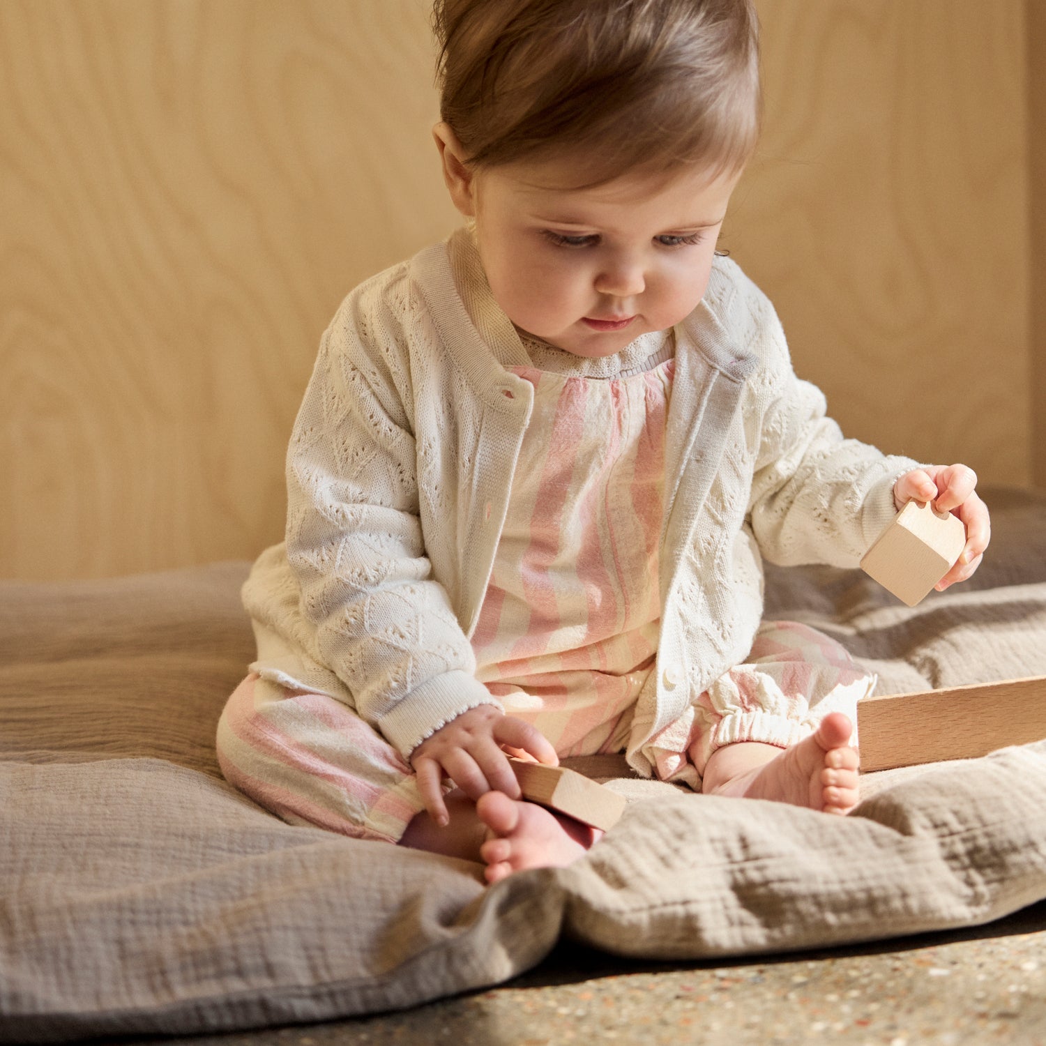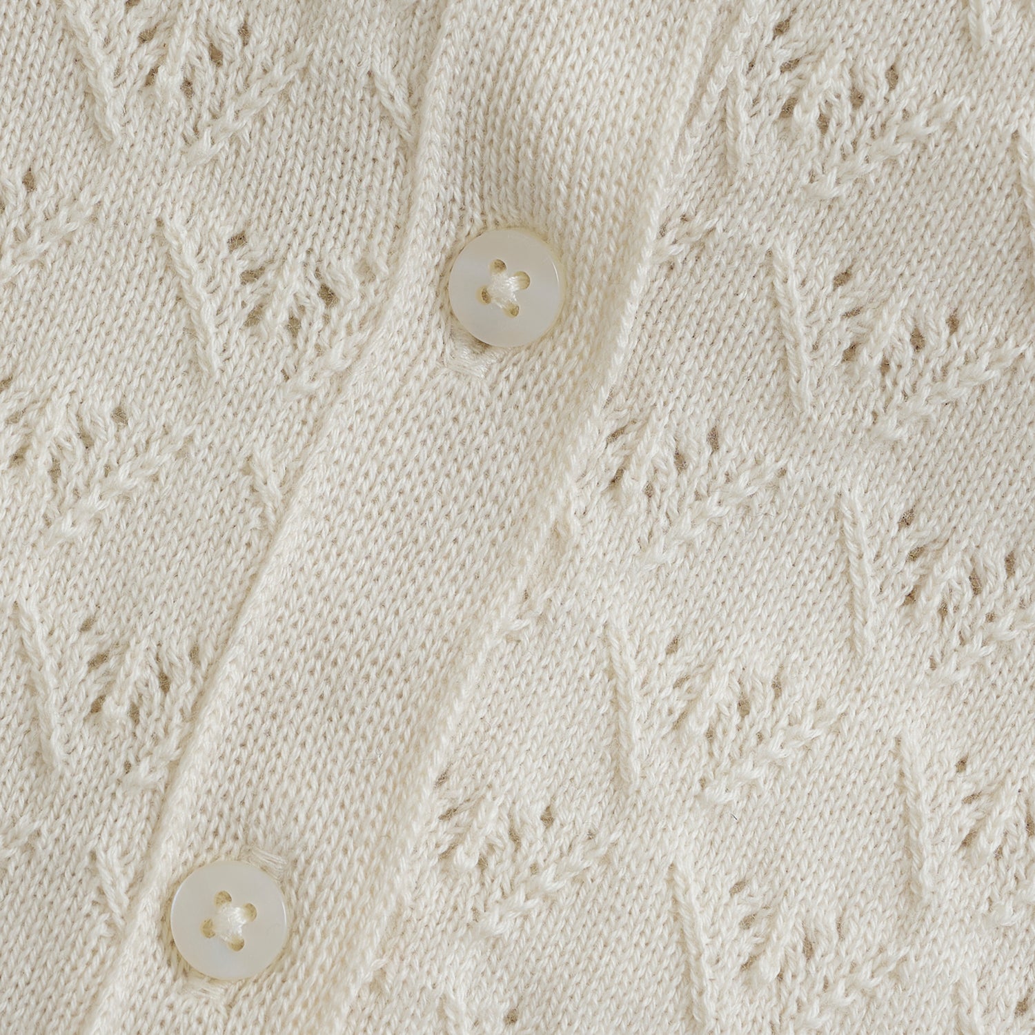 Dieser schöne Cardigan von Minymo besteht zu 100% aus Bio-Baumwolle. Der leichte Cardigan hat ein hübsches Strickmuster und ist gerippt am Halsausschnitt, an den Handgelenken und am Saum. Die Babystrickjacke wird vorne mit feinen Knöpfen geschlossen.