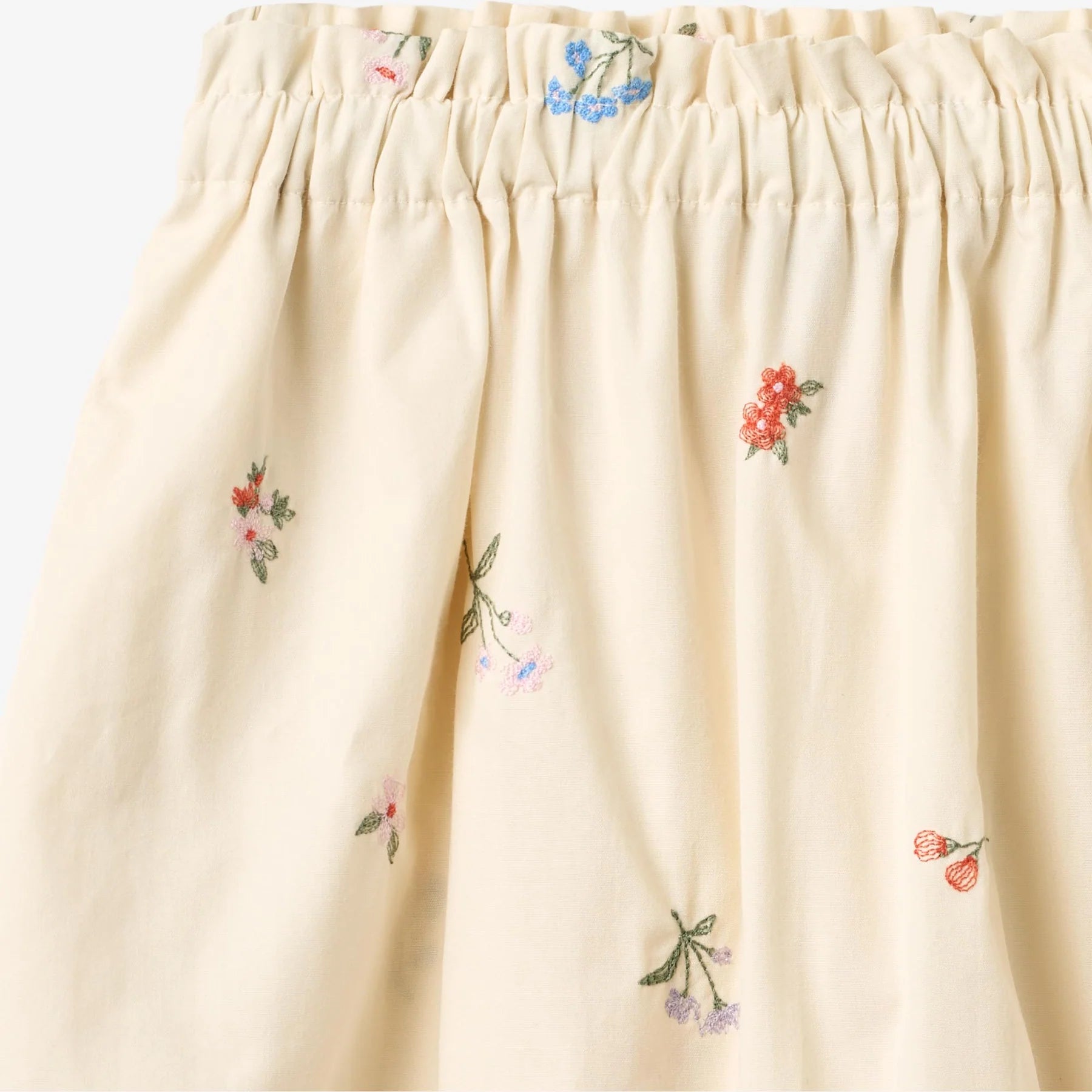 Der schöne Rock von Wheat besteht zu 100% aus Bio-Baumwolle. Der Rock geht bis übers Knie, hat einen elastischen Bund mit verstellbarem Gummizug in der Taille und wunderschöne kleinen aufgestickten Blumen. Die Raffung unterhalb des Bundes lässt den Rock schön fallen.