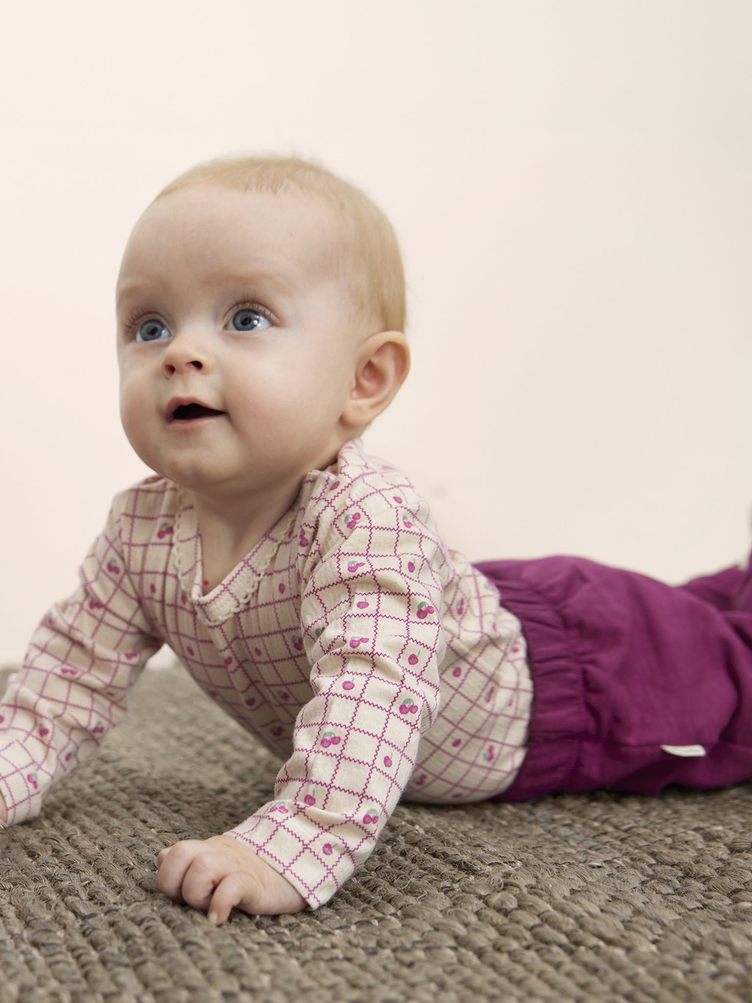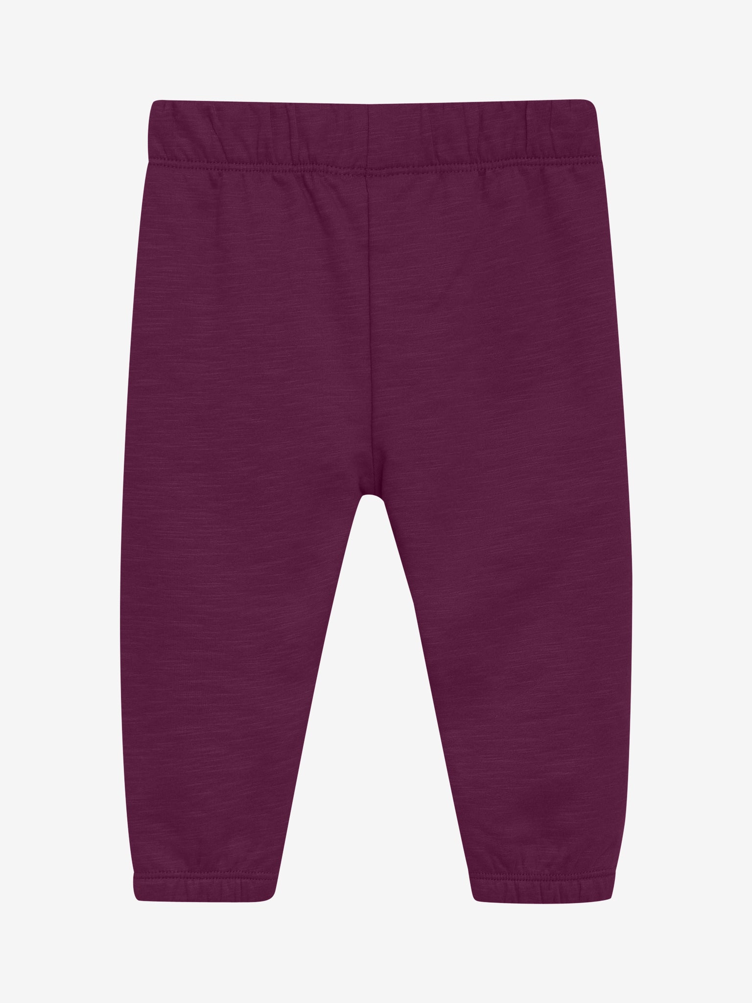 The comfortable pants for babies in a jogging pants look from Minymo are made of soft organic cotton and therefore feel very comfortable on the skin. The baby trousers have an elastic waistband, two side pockets and two decorative buttons on the mock fly. The leg cuffs are folded up, which gives the pants a cool look.
