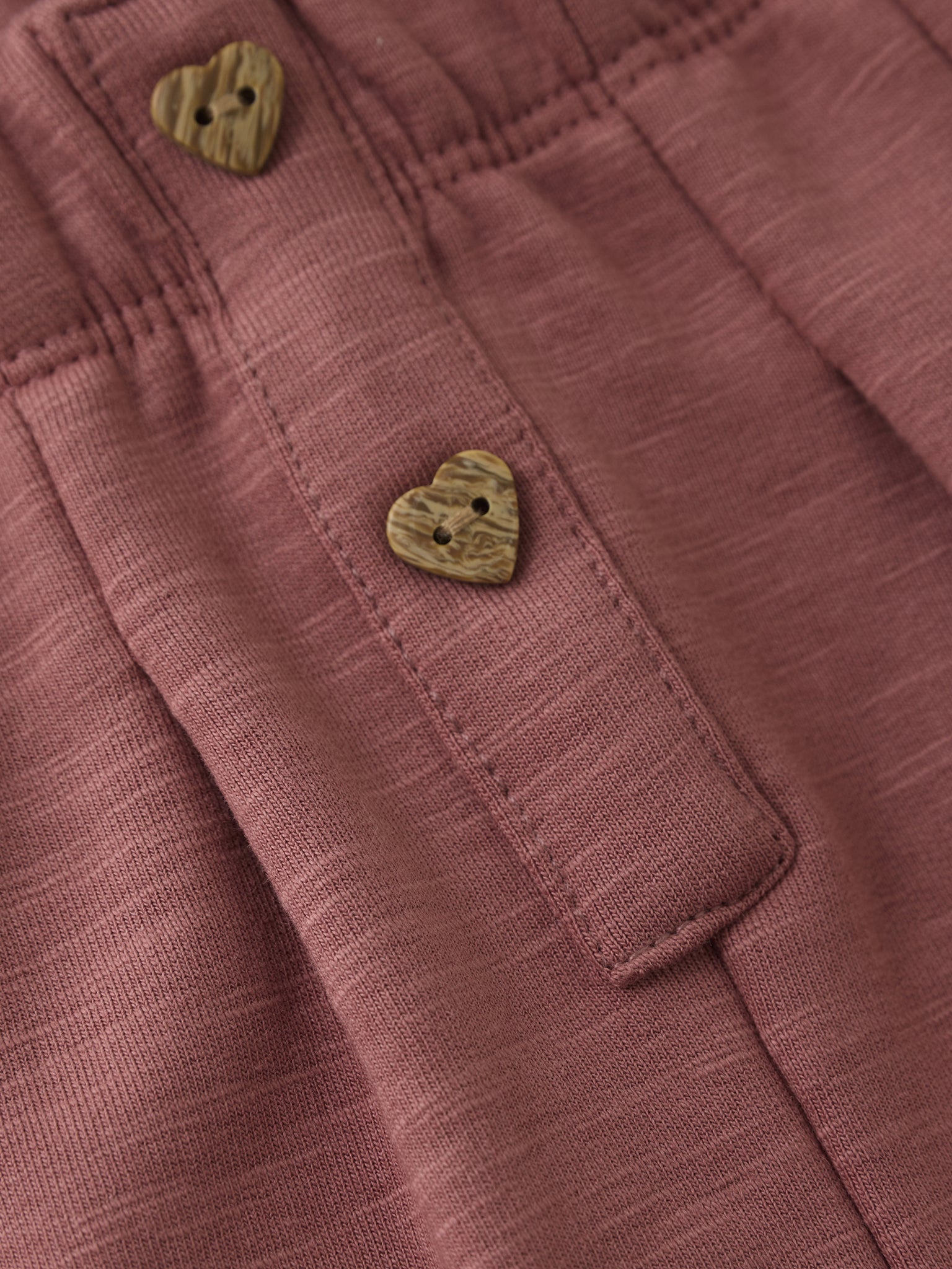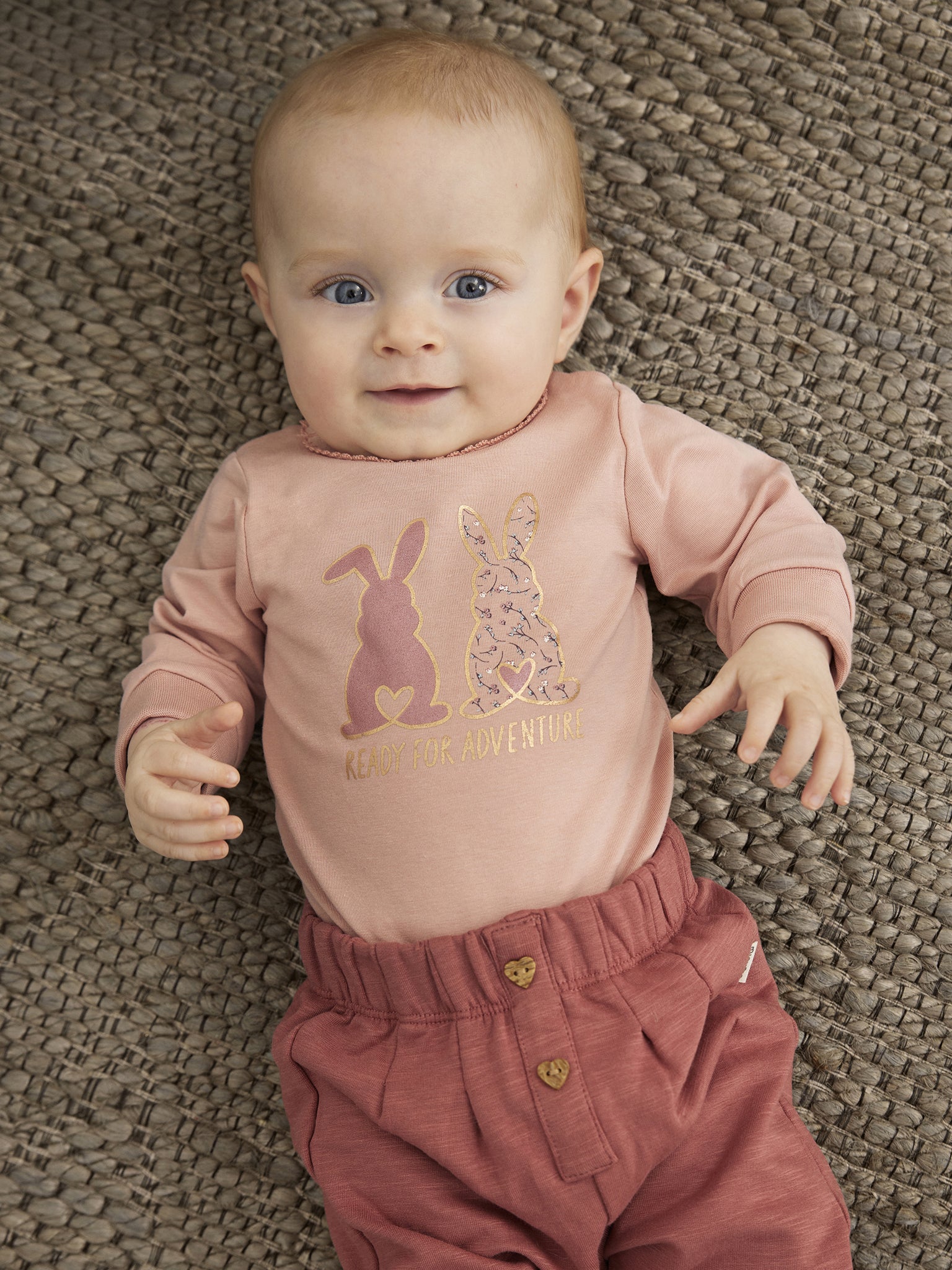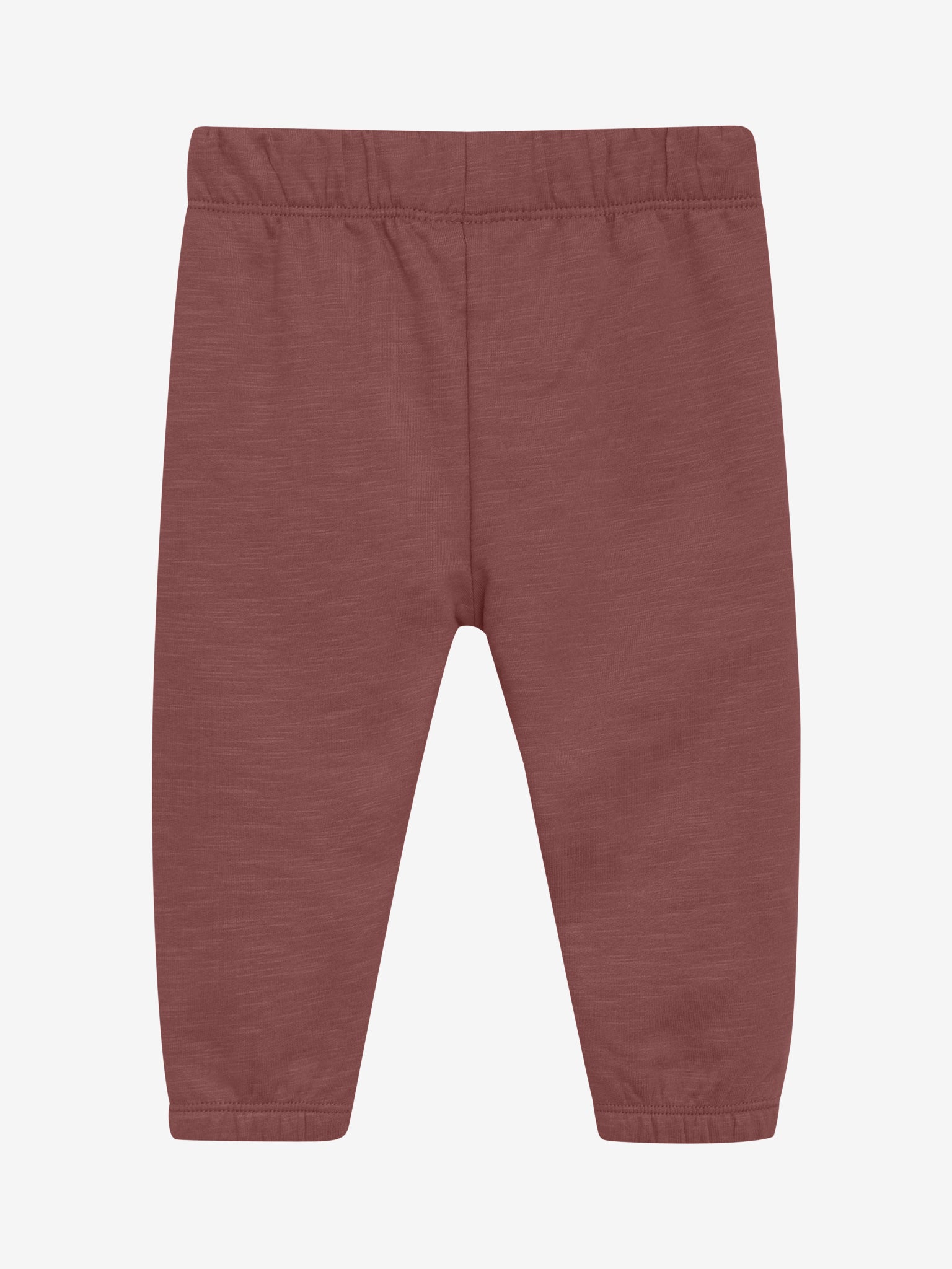 The comfortable pants for babies in a jogging pants look from Minymo are made of soft organic cotton and therefore feel very comfortable on the skin. The baby trousers have an elastic waistband, two side pockets and two decorative buttons on the mock fly. The leg cuffs are folded up, which gives the pants a cool look.