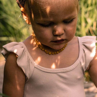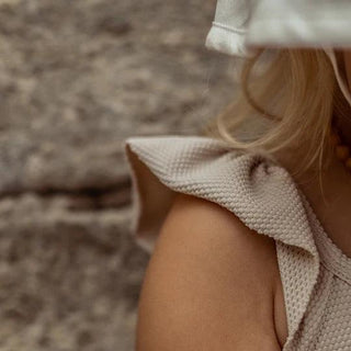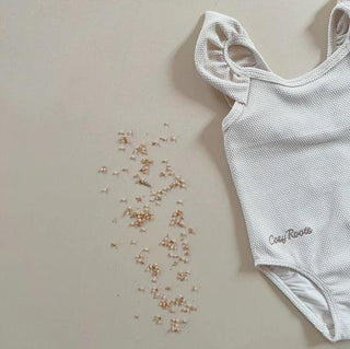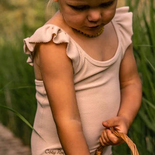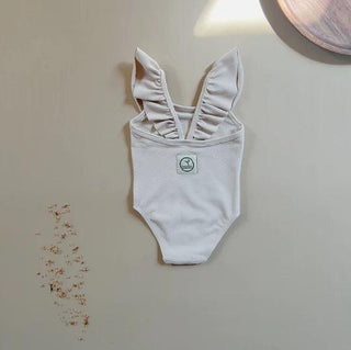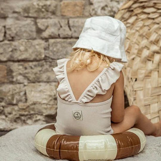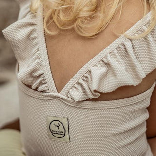 Beautiful and above all sustainable swimsuit in the color sand and playful ruffles from Cozy Roots.