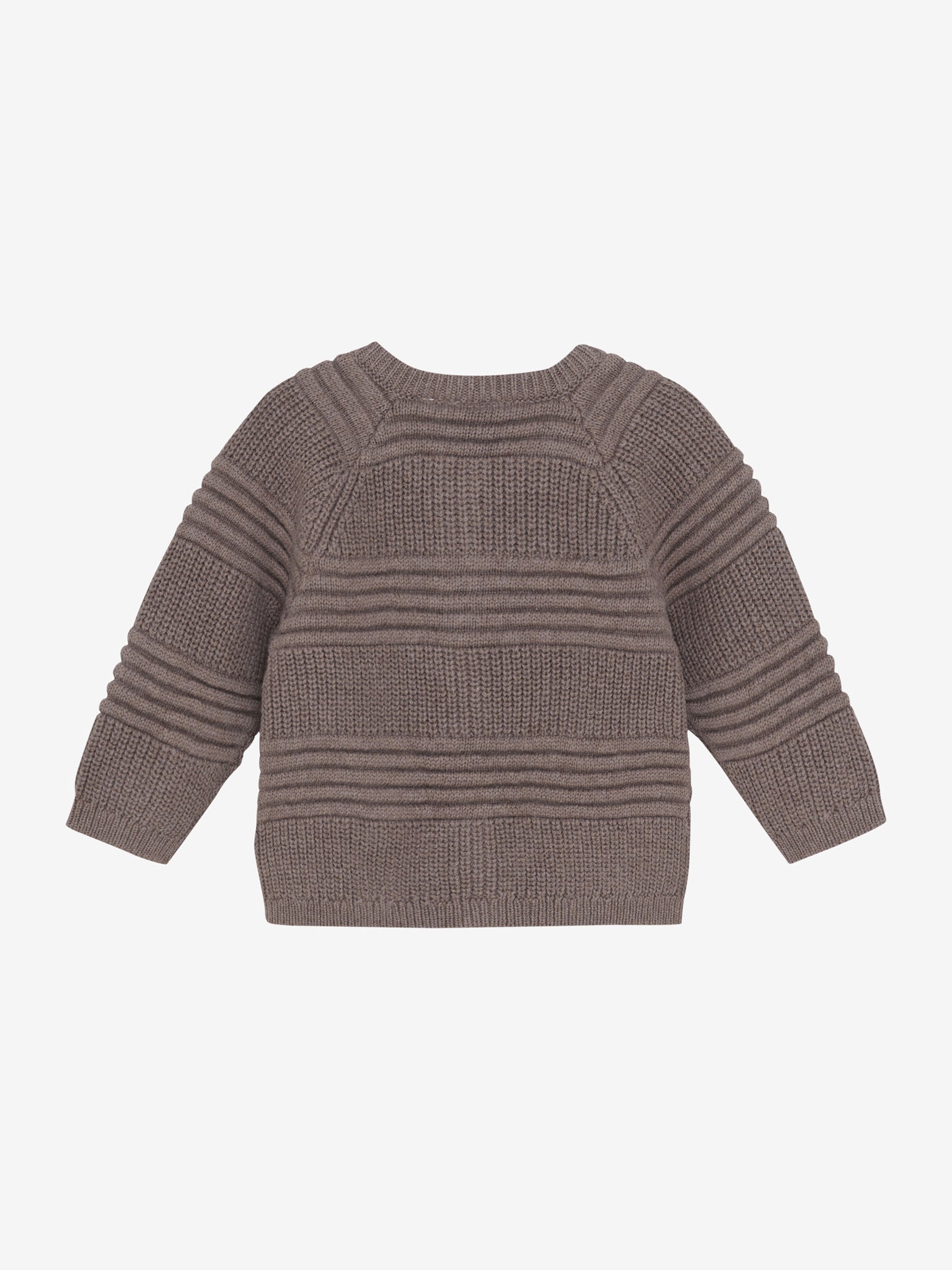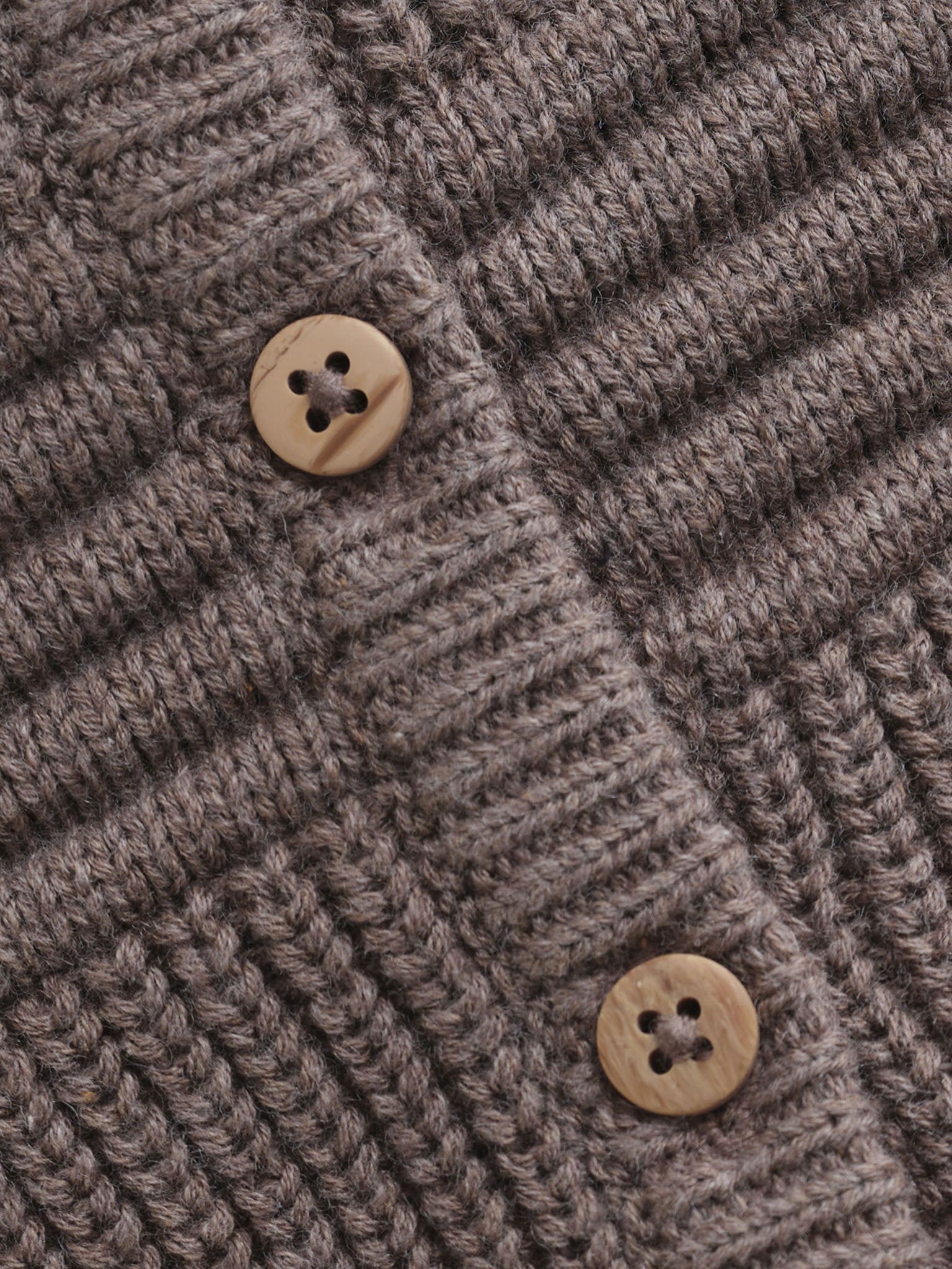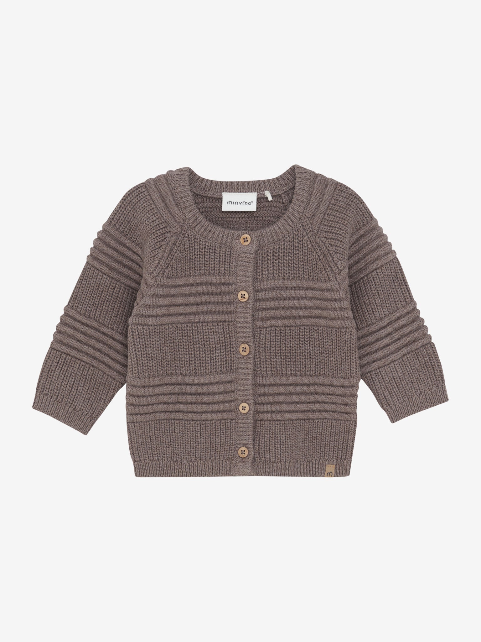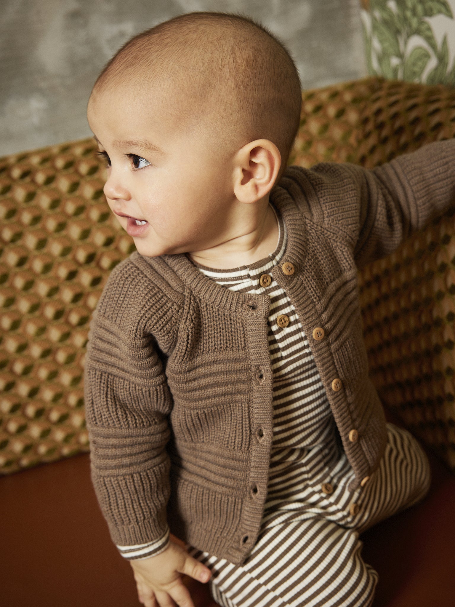The beautiful cardigan from Minymo is made from 100% organic cotton. The cardigan has a special knit pattern and is ribbed at the neckline, wrists, button placket and hem. The baby cardigan closes at the front with wooden buttons. The color jade green goes wonderfully with beige, soft pink or white and can therefore be combined with various one-piece suits or bodysuits and trousers.