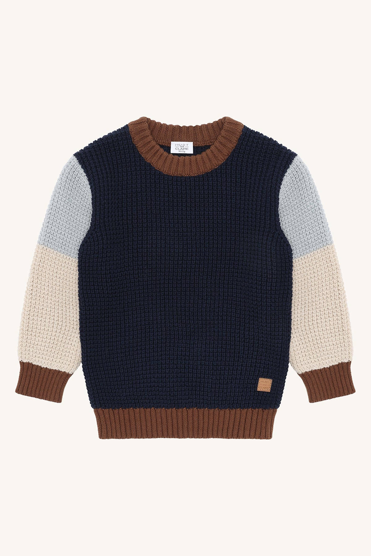Dieser schöne gestrickte Pullover von Hust and Claire besteht zu 100% aus Bio-Baumwolle. Der bequeme Kinderpullover hat gerippte Bündchen und ein sehr schöne Farbkonstellation.