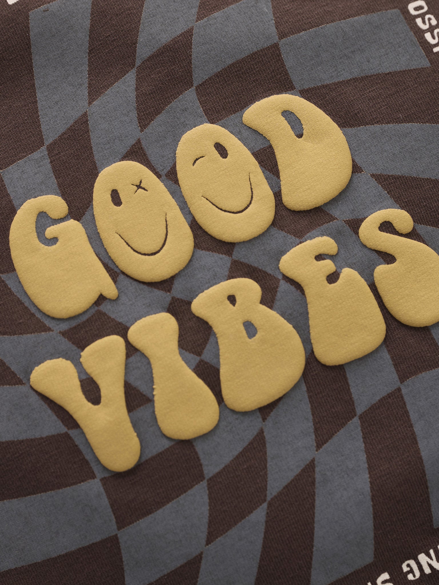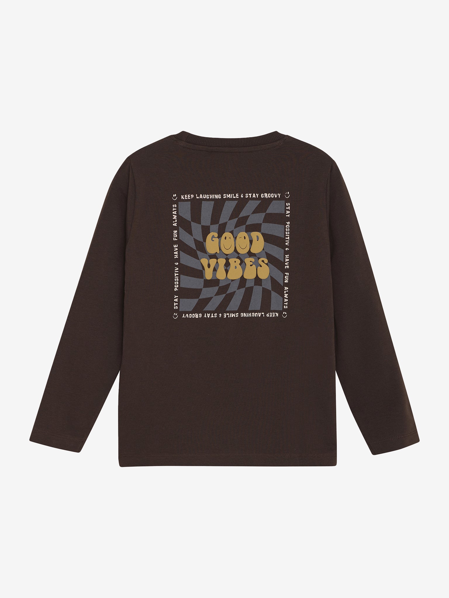Dieses coole langarm Shirt von Minymo besteht aus Bio-Baumwolle. Diese weiche Baumwollmischung macht aus dem Longsleeve ein kuscheliges Kleidungsstück. Das schöne Kindershirt hat einen Rundhalsausschnitt mit gerippten Kanten. Das bequeme Shirt hat einen coolen Smiley auf der linken Brust und einen lässigen "GOOD VIPES" Print auf dem Rücken.