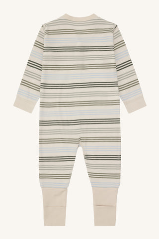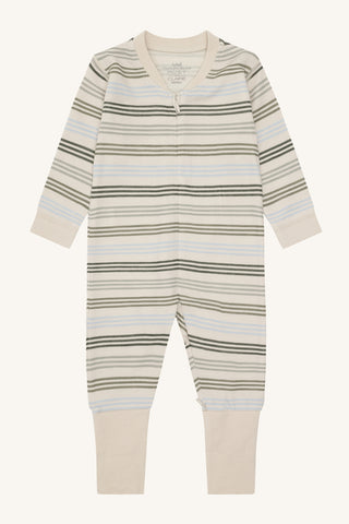 Der langärmlige Overall von Hust and Claire ist aus bequemer Merinowolle und Bambusviskose. Der weiche Einteiler ist beige und hat versieden farbige Streifen. Der Pyjama wird vorne mit einem Reissverschluss von Oben nach Unten oder von Unten nach Oben geschlossen. Der kuschelige Wolle/Bambus Strampler verfügt über längere Bündchen bei den Füssen, welche als Socken umgeklappt werden können. Die Klappfüsse sind bis zur Grösse 86 erhältlich. Der kuschelige Pyjama wird dank seiner wärmeregulierenden Fähigkeit gerne am Tag und in der Nacht getragen. Der kuschelige Strampler hat aussen eine Wollschicht und innen feine Bambusviskose. Der Materialmix eignet sich optimal für die kältere Jahreszeit.
